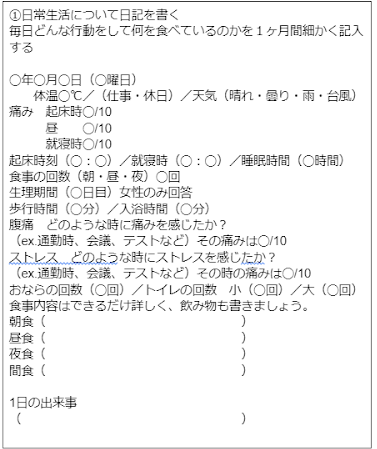 最近3ヵ月間、月に4回以上腹痛が起こり、次の項目の内、2つ以上があること